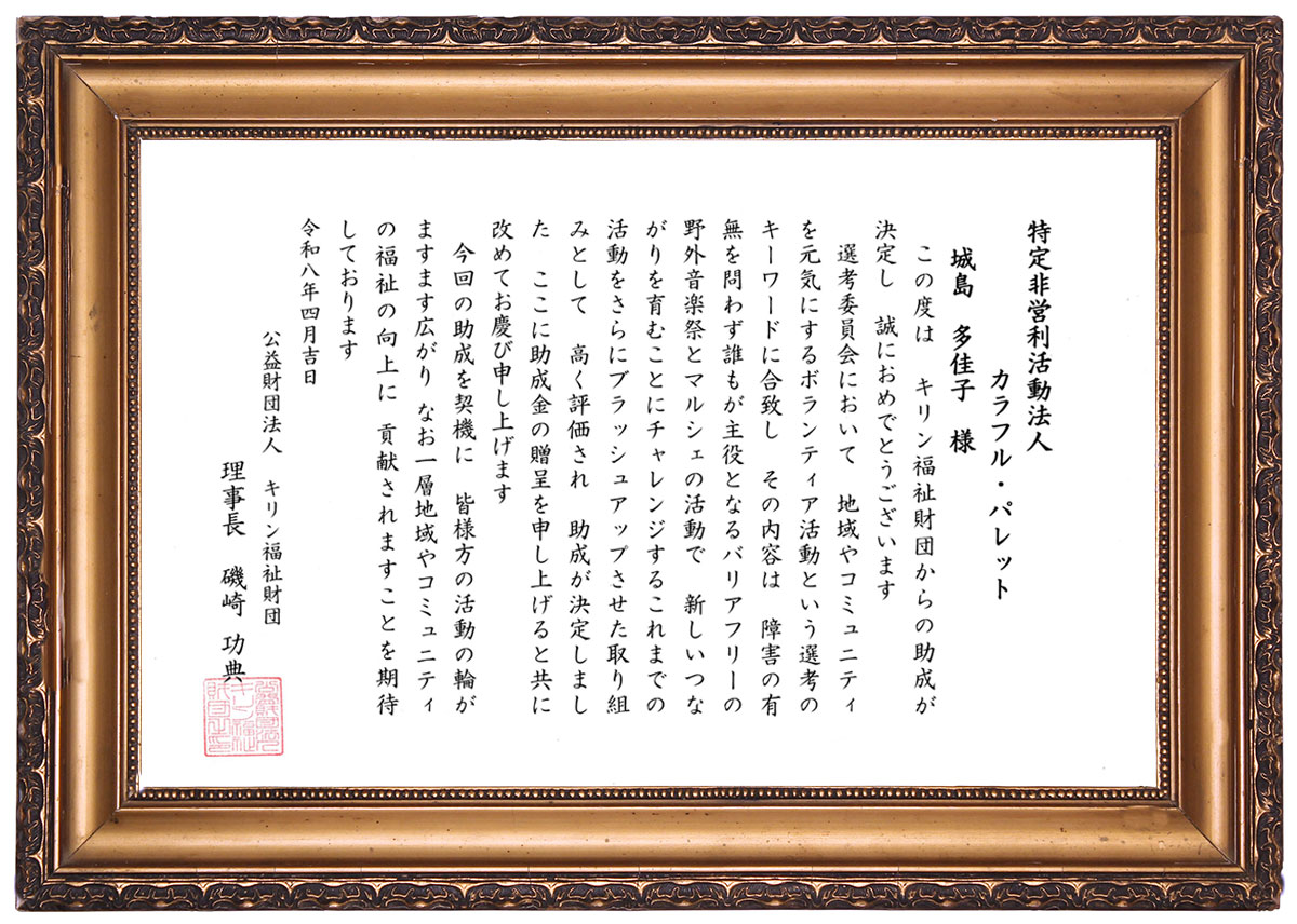 しかし、令和8年度、再びキリン福祉財団様の助成金をいただけることとなりました!本日郵送にて贈呈状をいただき、本当に助成決定したんだ、と改めてじーーんと感動しました。本当にうれしいです。